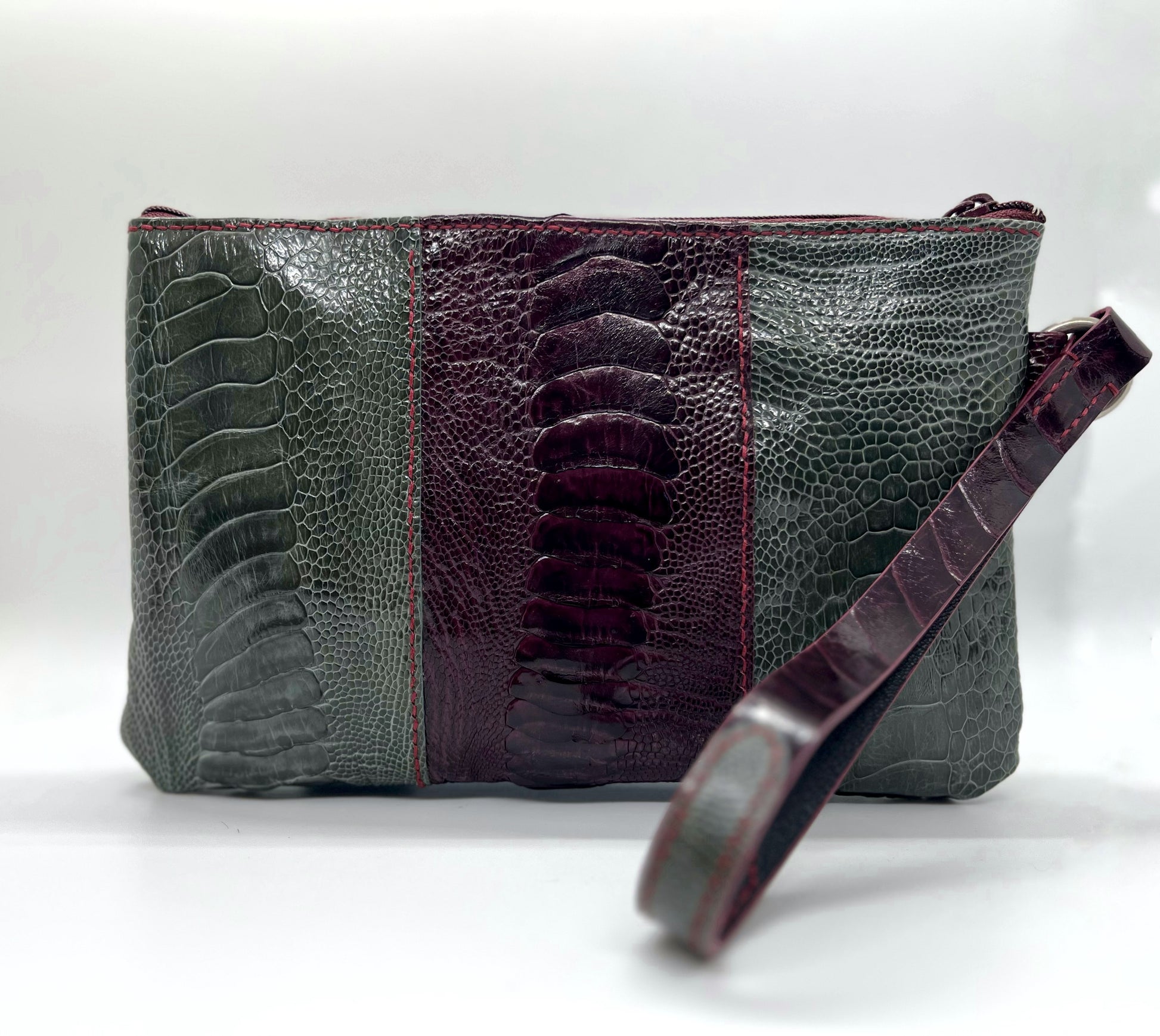 Soft greyed green & burgundy ostrich legs clutch/wristlet